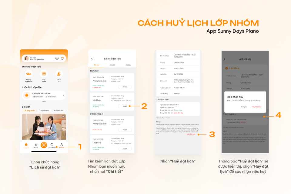 Cách huỷ lịch đặt lịch học lớp Trải nghiệm HLV app Sunny Days Piano