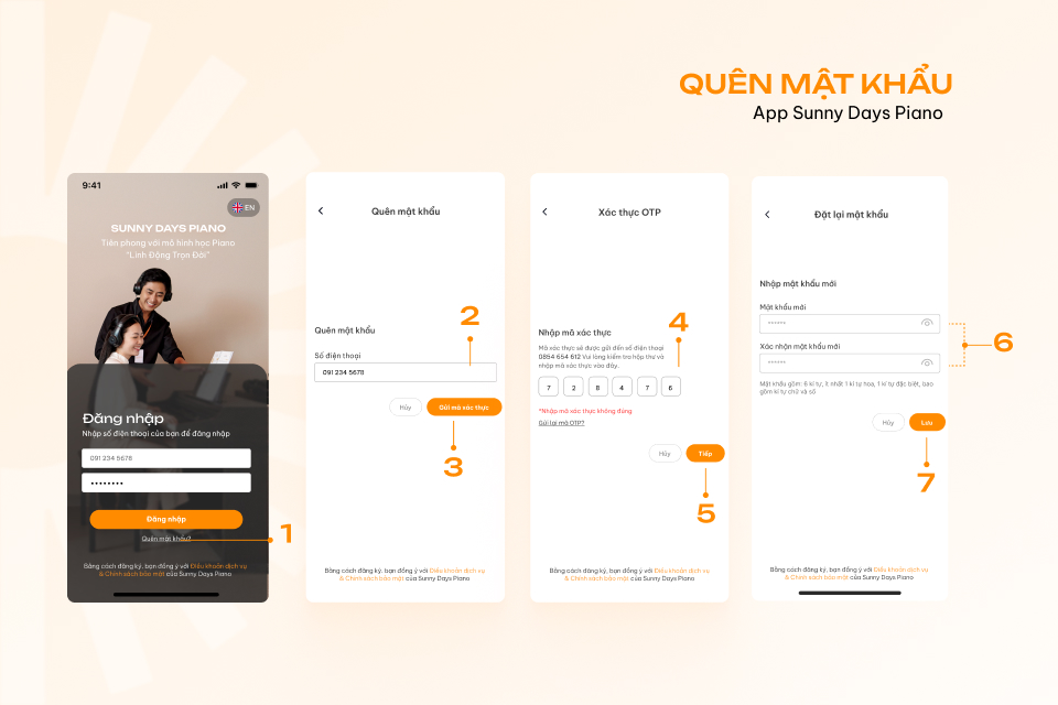 Thông tin cá nhân, mật khẩu cùng hợp đồng đăng ký các gói học piano được app Sunny Days Piano lưu trữ cá nhân hoá, đảm bảo tính bảo mật, giúp học viên kiểm soát thời hạn cùng các điều khoản hợp đồng tiện lợi hơn. Một số vấn đề liên quan đến mật khẩu, học viên có thể tham khảo các trường hợp sau đây: